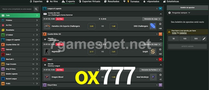 O ox777 oferece uma grande seleção de opções de apostas em e-sports com probabilidades competitivas